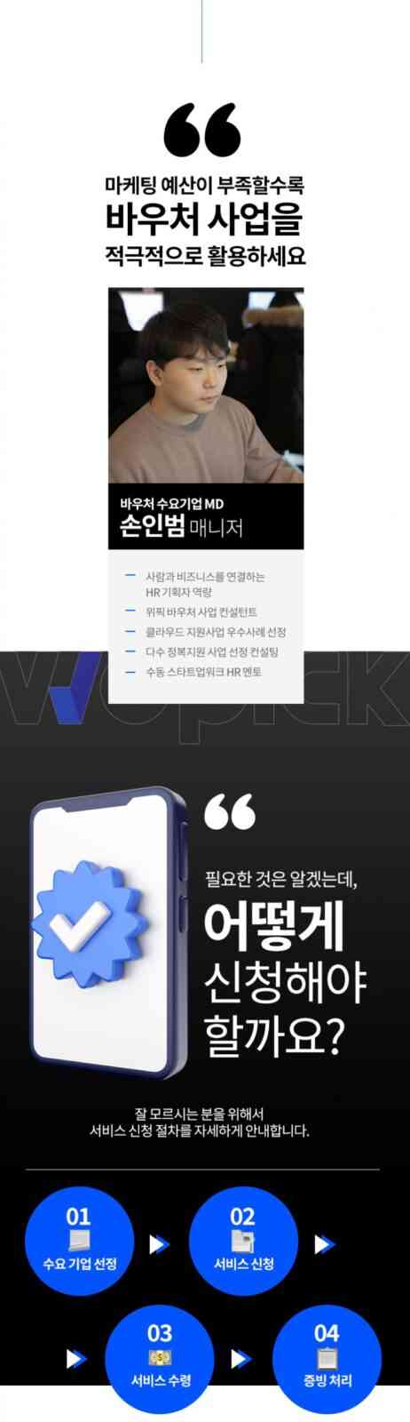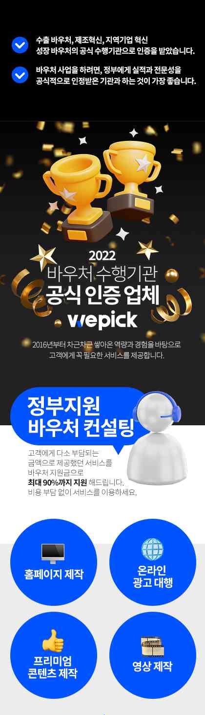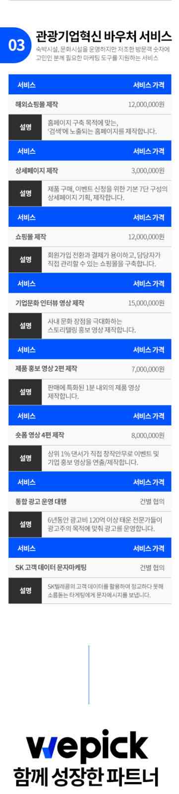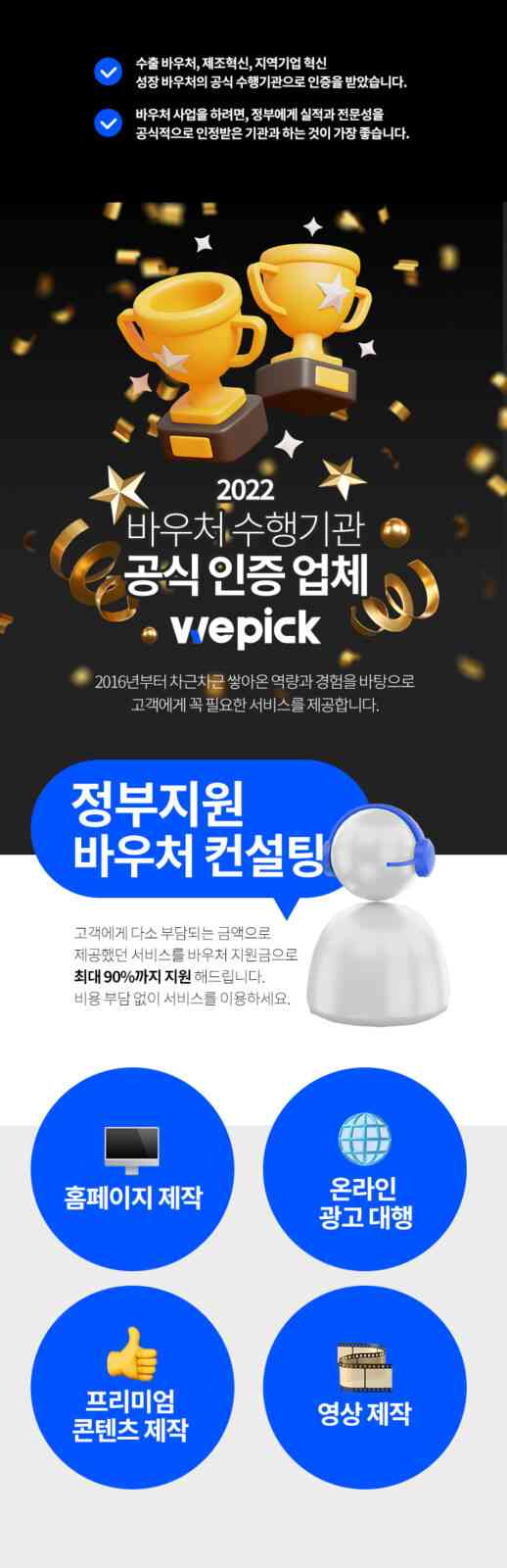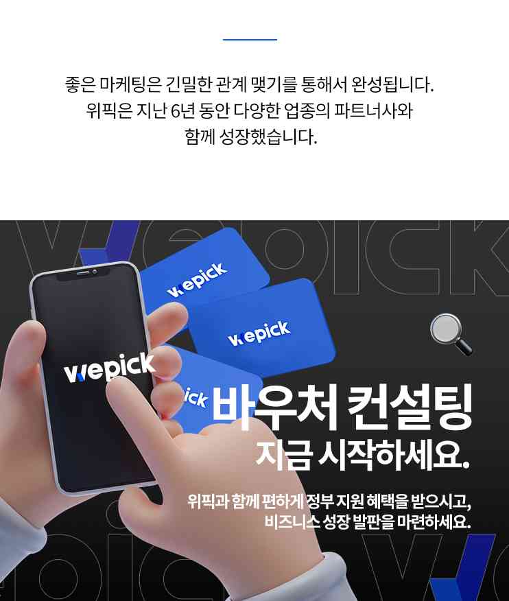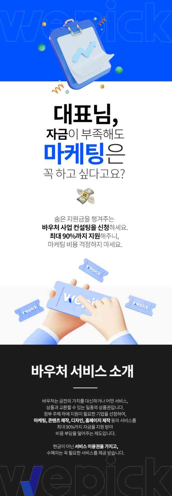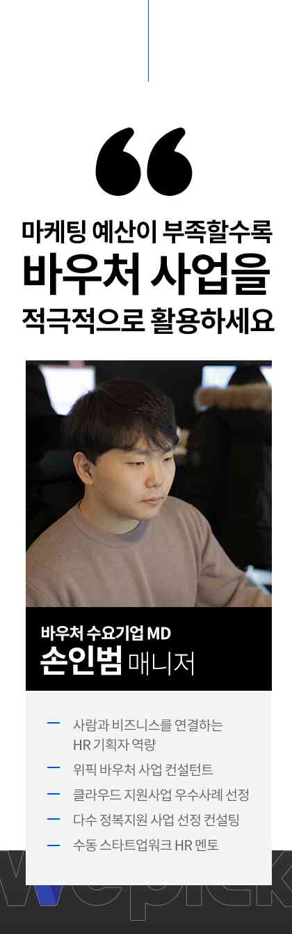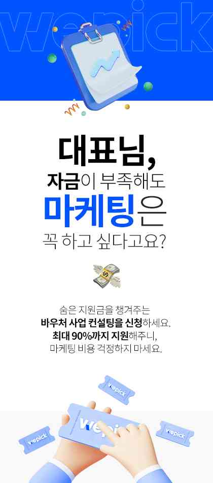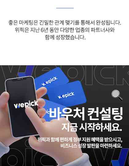비용이 많이 드는 마케팅, 최대 90%까지 정부 지원이 가능합니다. 3개 바우처 공식 업무 기관 위픽코퍼레이션과 저렴하세요.